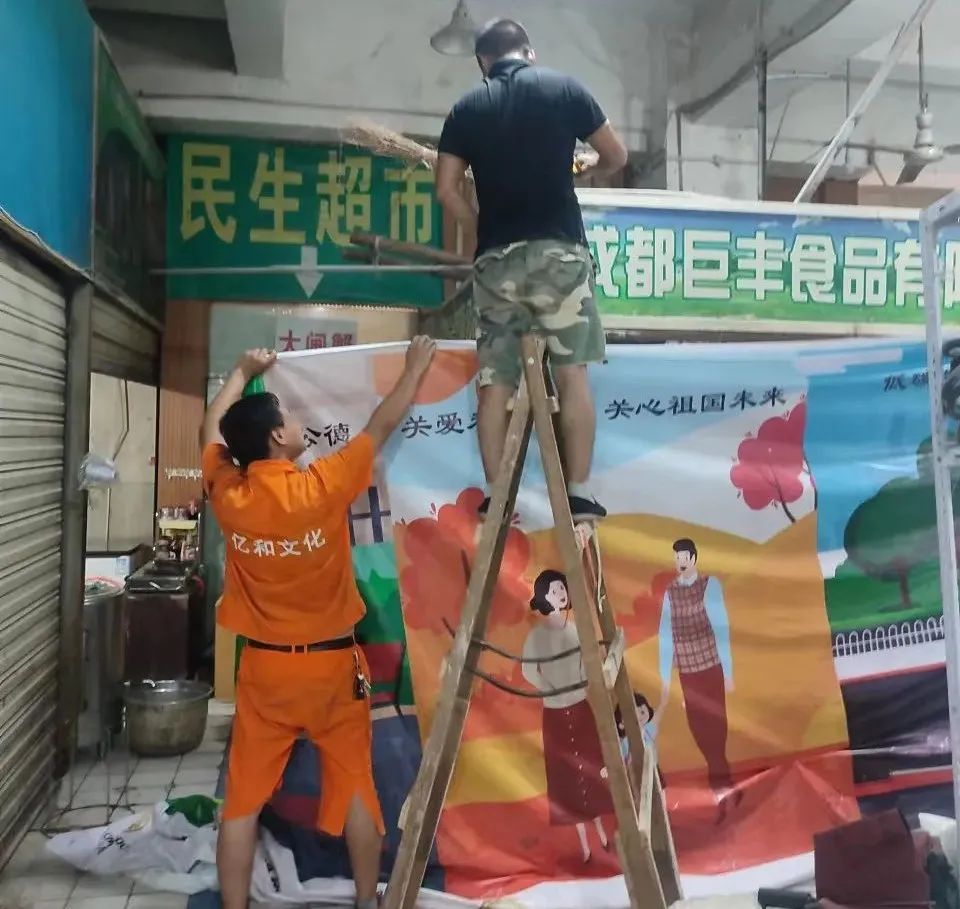 為(wèi)更好地開展精(jīng)神文(wén)明建設工(gōng)作(zuò),滿足群衆日異月新(xīn)的精(jīng)神文(wén)化需求,助推各項事業的有(yǒu)序發展。2022年以來億和文(wén)化在成華區(qū)開展了一系列的精(jīng)神文(wén)明創建宣傳工(gōng)作(zuò),包括設計制作(zuò)與現場安(ān)裝(zhuāng)。我們的工(gōng)作(zuò)人員,為(wèi)了能(néng)盡快落實相關宣傳用(yòng)品的安(ān)裝(zhuāng)張貼工(gōng)作(zuò),他(tā)們在40多(duō)度的室外埋頭苦幹,他(tā)們在熱浪翻湧的地面屈膝上百次,汗水布滿了他(tā)們的臉龐,也浸濕了他(tā)們的衣裳,卻絲毫不影響他(tā)們手上的動作(zuò)和工(gōng)作(zuò)的速度。他(tā)們不辭辛勞,不舍日夜,以專業的技(jì )術,高效地完成了一次又(yòu)一次的安(ān)裝(zhuāng)宣傳工(gōng)作(zuò)。夜間高空安(ān)裝(zhuāng)精(jīng)神文(wén)明建設燈杆道旗