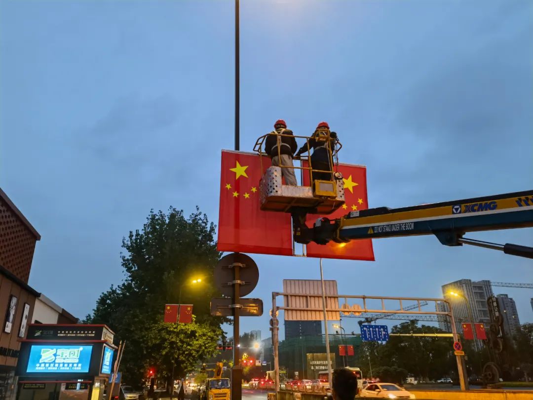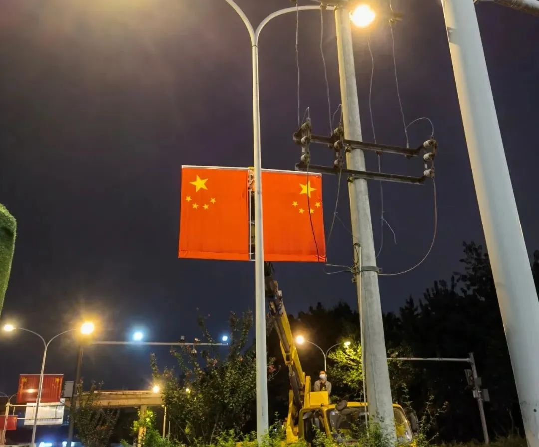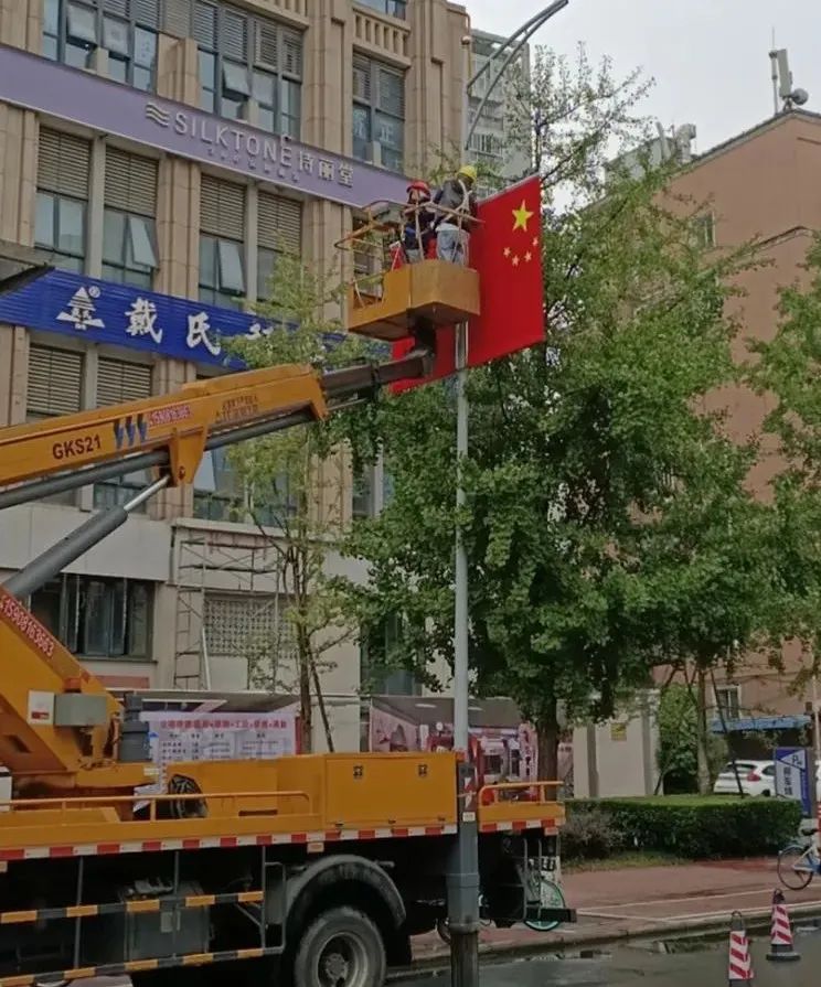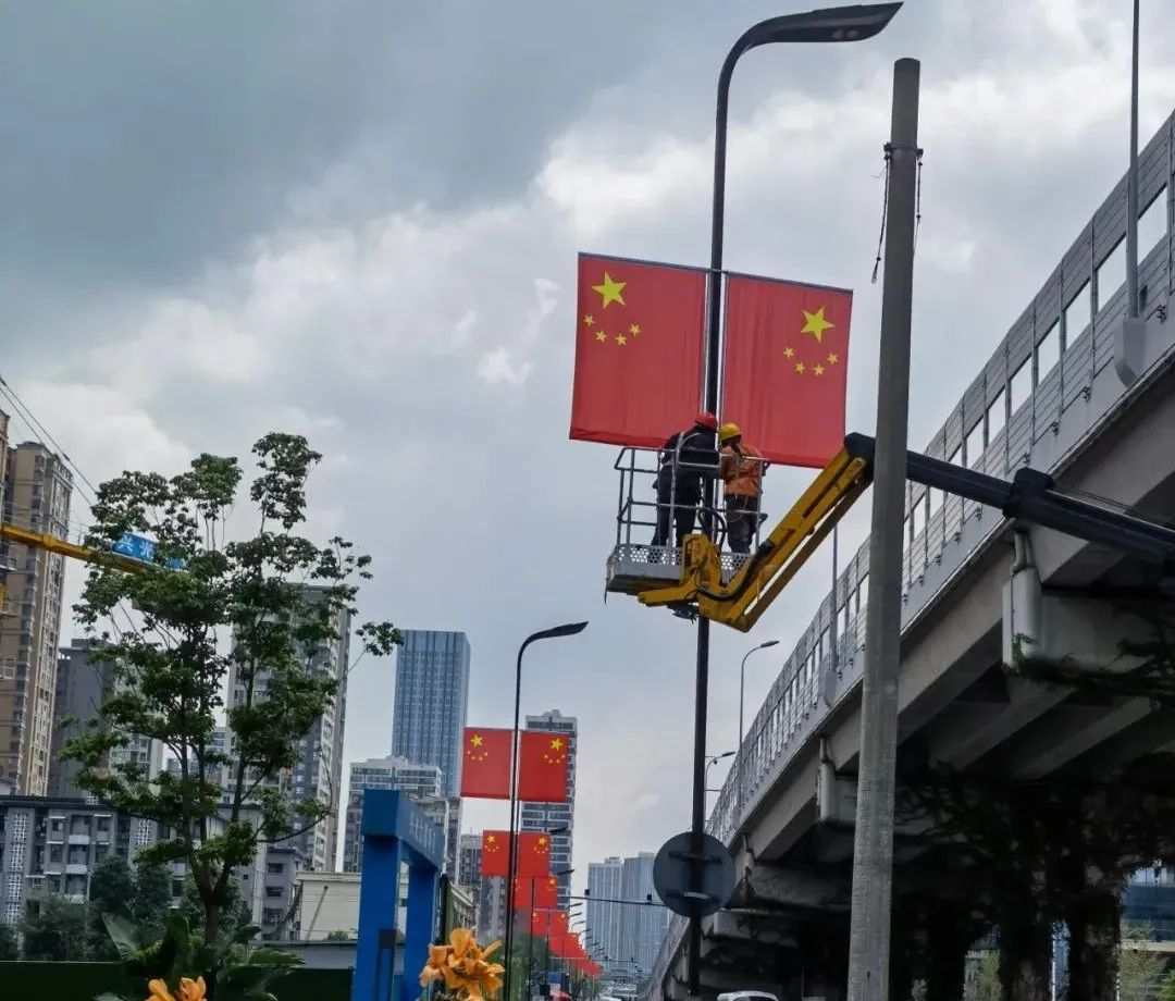 不管是風裏雨裏,白天還是黑夜,我們的安(ān)裝(zhuāng)工(gōng)人們為(wèi)錯開出行高峰時段,夜以繼日的穿梭在各個街(jiē)道,以“優質(zhì)快速、安(ān)全文(wén)明”的工(gōng)作(zuò)方針,利用(yòng)吊車(chē)、焊機等機具(jù),按照統一的标準,專業地将國(guó)旗安(ān)裝(zhuāng)在街(jiē)道兩側的燈杆上,保證懸挂的位置、高度,都精(jīng)準統一。鮮豔的五星紅旗,映襯着藍天白雲,成為(wèi)成都街(jiē)頭最美的風景線(xiàn)。