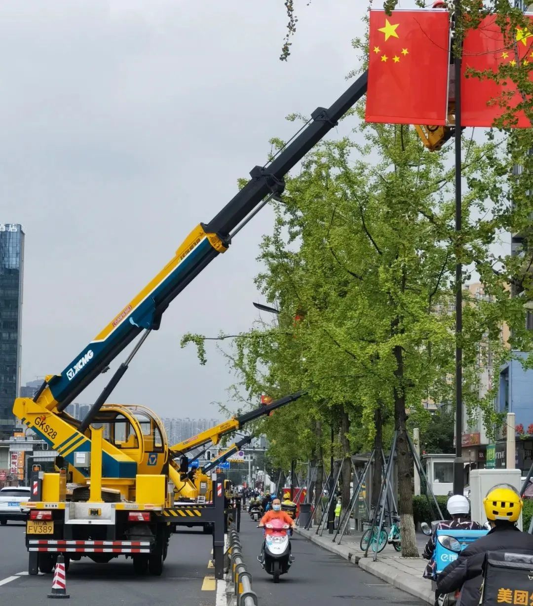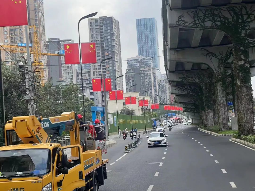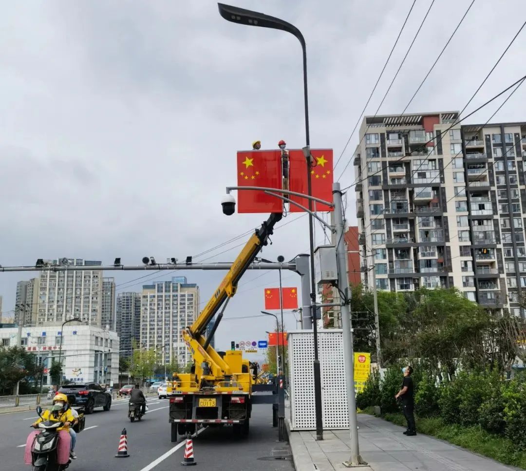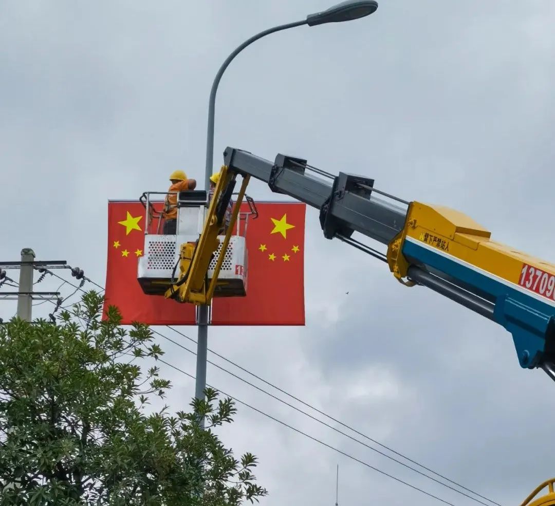 不管是風裏雨裏,白天還是黑夜,我們的安(ān)裝(zhuāng)工(gōng)人們為(wèi)錯開出行高峰時段,夜以繼日的穿梭在各個街(jiē)道,以“優質(zhì)快速、安(ān)全文(wén)明”的工(gōng)作(zuò)方針,利用(yòng)吊車(chē)、焊機等機具(jù),按照統一的标準,專業地将國(guó)旗安(ān)裝(zhuāng)在街(jiē)道兩側的燈杆上,保證懸挂的位置、高度,都精(jīng)準統一。鮮豔的五星紅旗,映襯着藍天白雲,成為(wèi)成都街(jiē)頭最美的風景線(xiàn)。