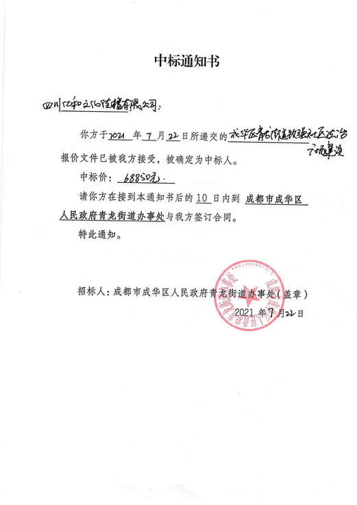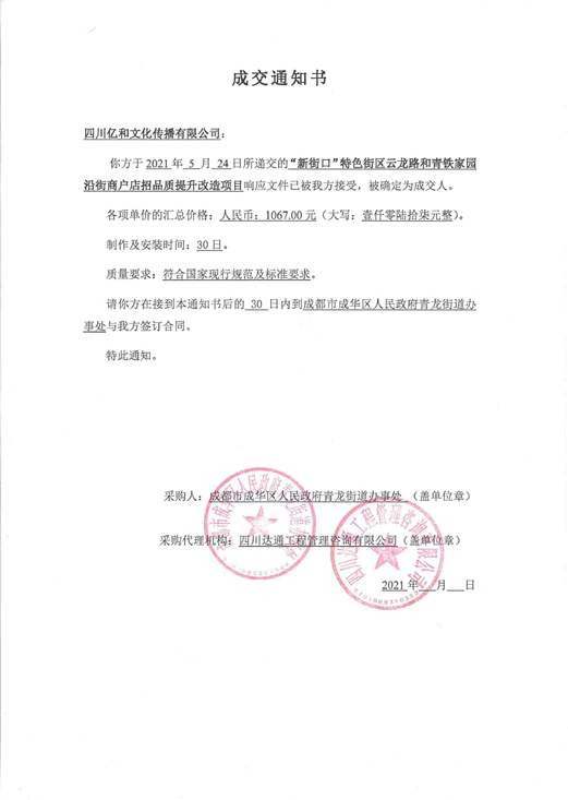 【喜訊】公(gōng)司中(zhōng)标2021年“成都市成華區(qū)人民(mín)政府青龍街(jiē)道'新(xīn)街(jiē)口’特色街(jiē)區(qū)雲龍路和青鐵家園沿街(jiē)商(shāng)戶店(diàn)招品質(zhì)提升改造項目”!