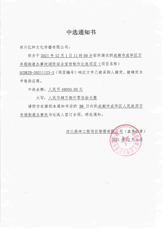 【喜訊】公(gōng)司中(zhōng)标2021年“成都市成華區(qū)萬年場街(jiē)道辦(bàn)事處消防安(ān)全宣傳制作(zuò)比選項目”!