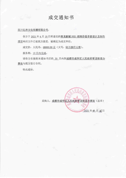 【喜訊】公(gōng)司中(zhōng)标2021年“成都市成華區(qū)人民(mín)政府青龍街(jiē)道青龍新(xīn)城2021招商(shāng)價值手冊設計及制作(zuò)項目”!