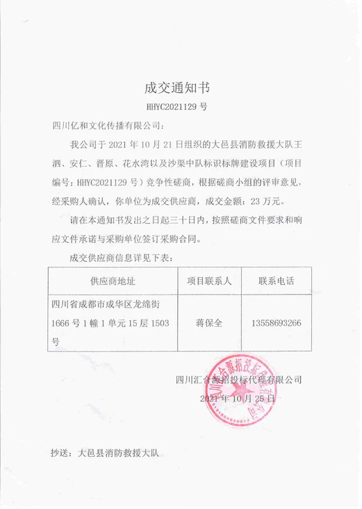 【喜訊】公(gōng)司中(zhōng)标2021年“成都市大邑縣消防救援大隊王泗、安(ān)仁、晉原、花(huā)水灣以及沙渠中(zhōng)隊标識标牌建設項目”!