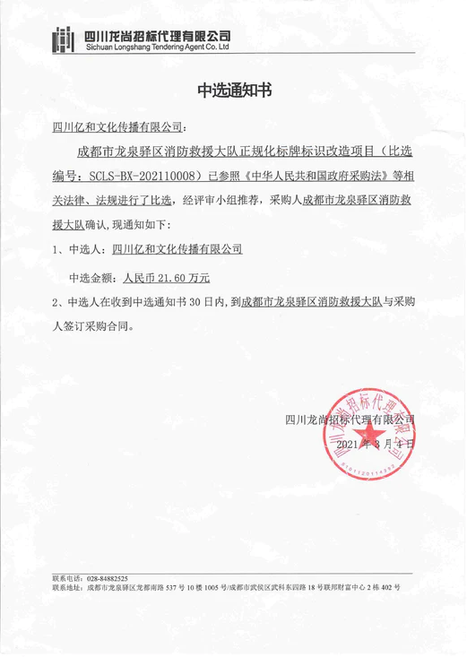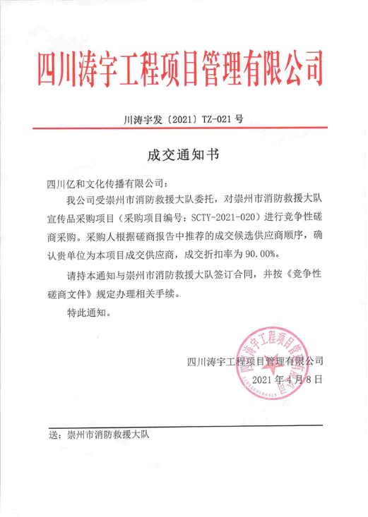 【喜訊】公(gōng)司中(zhōng)标2021年“成都市崇州市消防救援大隊宣傳品采購(gòu)項目”!