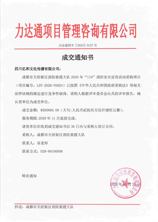 【喜訊】公(gōng)司中(zhōng)标2020年“成都市龍泉驿區(qū)消防救援大隊消防宣傳月活動服務(wù)項目”!