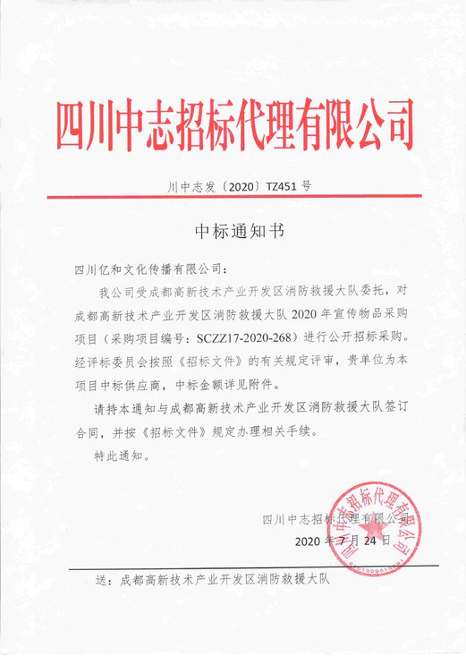 【喜訊】公(gōng)司中(zhōng)标2020年“成都高新(xīn)技(jì )術産(chǎn)業開發區(qū)消防救援大隊2020年宣傳物(wù)品采購(gòu)項目”!